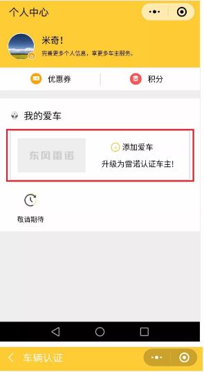 雷諾車主,廠家福利大派送 小諾準(zhǔn)備大聲地告訴您: 是時(shí)候動(dòng)動(dòng)手 把小諾為您準(zhǔn)備的精美禮品 帶回家啦! 一等獎(jiǎng):東風(fēng)雷諾云伴遠(yuǎn)程視頻車 二等獎(jiǎng):東風(fēng)雷諾反向傘 方便車主而貼心設(shè)計(jì),大雨來(lái)臨之時(shí),只需小小的車門縫,就可以開(kāi)收傘自如。 三等獎(jiǎng):東風(fēng)雷諾定制手機(jī)支架 強(qiáng)韌有力的工藝設(shè)計(jì),保證手機(jī)在行車途中不會(huì)晃動(dòng)、掉落。讓開(kāi)車接聽(tīng)電話更安全。 諾米們是不是已經(jīng)按捺不住了 快跟著小諾 收下攻略,動(dòng)動(dòng)手指 把禮品帶回家吧! 先關(guān)注東風(fēng)雷諾車友會(huì)官方微信公眾號(hào) 返回東風(fēng)雷諾車友會(huì)主頁(yè)面,點(diǎn)擊左下角菜單欄【個(gè)人中心】,進(jìn)入車主認(rèn)證通道。 認(rèn)真填寫愛(ài)車信息,上傳行駛證主頁(yè)、副業(yè)。在行駛證上能找到您的車輛識(shí)別代號(hào)和發(fā)動(dòng)機(jī)號(hào),再輸入手機(jī)號(hào)和驗(yàn)證碼,即可綁定成功啦! 完成認(rèn)證,便可以開(kāi)始抽獎(jiǎng)啦!注意:一位車主只有一次抽獎(jiǎng)機(jī)會(huì)哦。 如您中獎(jiǎng),您將會(huì)收到一條中獎(jiǎng)短信通知 務(wù)必在1個(gè)月內(nèi)憑中獎(jiǎng)短信到武漢法雷專營(yíng)店領(lǐng)取禮品 *注:本次活動(dòng)僅限未認(rèn)證會(huì)員的車主參與